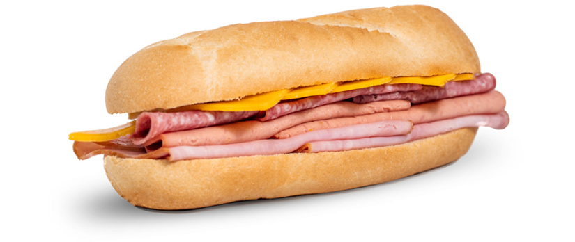 Related Items Club Sub Italian Sub Duchess Sub Our first ever sub at Duchess was this delicious sub with layers of freshly sliced ham, bologna, salami, and colby cheese, on a fresh, soft, sub bun. Come and try one for yourself! 710 Calories 36 Fat (g) 56 Carbs (g) 38 Protein (g) Ingredients > x 8″ White Sub Roll: ENRICHED WHEAT FLOUR (WHEAT FLOUR, MALTED BARLEY FLOUR, NIACIN, REDUCED IRON, THIAMIN MONONITRATE, RIBOFLAVIN, FOLIC ACID), WATER, SUGAR, YEAST, WHEAT GLUTEN, SALT, MALTED BARLEY EXTRACT, CALCIUM PROPIONATE (PRESERVATIVE), DOUGH CONDITIONERS (DIACETYL TARTARIC ACID ESTERS OF MONO AND DIGLYCERIDES, SODIUM STEAROYL LACTYLATE, ASCORBIC ACID, ENZYMES, L-CYSTEINE, AZODICARBONAMIDE), MALTED BARLEY FLOUR., Ham: Cured with water, Salt, Sugar, Dextrose, Sodium Phosphates, Sodium Erythorbate, Sodium Nitrite., Bologna: Pork, Water, Beef, Salt, Contains 2% or less Sodium Lactate, Corn Syrup, Dextrose, Flavoring, Sodium Diacetate, Sodium Erythorbate, Sodium Nitrite, Oleoresin of Paprika., Colby Cheese: Cultured pasteurized milk, Salt, Enzymes, Annatto coloring., Salami: Pork, Beef, Salt, Contains 2% or less of Dextrose, Water, Natural Spices, Sodium Ascorbic, Lactic Acid Starter Culture, Sodium Nitrite, Garlic Powder, BHA, BHT, Citric Acid. Full Nutrition Information > x 710 Calories 320 Calories from Fat 36 Total Fat (g) 16 Saturated Fat (g) 125 Cholesterol (mg) 2690 Sodium (mg) 56 Total Carbohydrates (g) 2 Dietary Fiber (g) 4 Sugars (g) 38 Protein (g) Related Items Club Sub Italian Sub